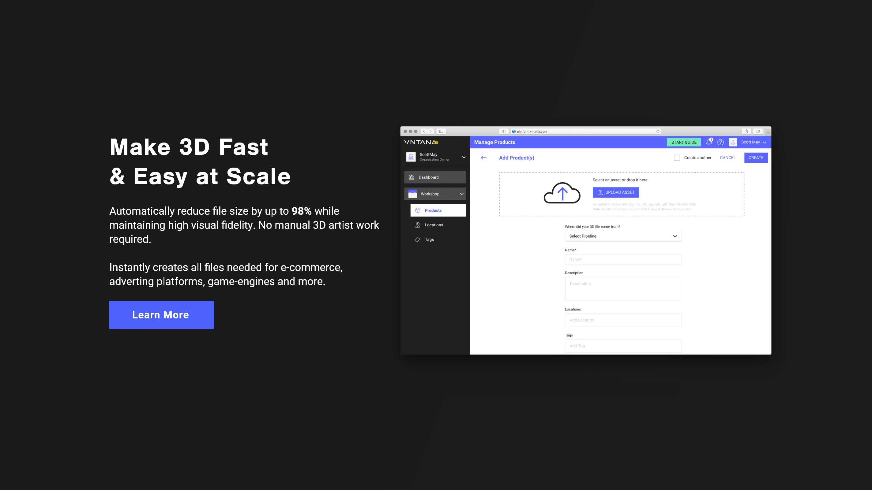 VNTANA's 3D Model Unreal plugin allows customers to instantly import optimized 3D models from the Platform and automate the 3D workflows so customers can focus on creating the immersive experience. We make publishing 3D products on the web as easy as Vimeo and YouTube for video.